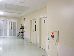 子どもたちが手術室に入る時に通る外廊下と中廊下。新しい棟で壁面もきれいですが、なんとも寂しい空間とのご相談でした。