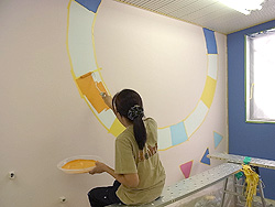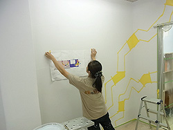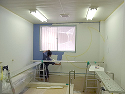 完成。浴室ですが、今回は天井ではなくて壁面柄。富士山柄(銭湯?)ではありません。 湯気の中ではどんな風に見えるでしょう。子どもたちの感想が楽しみです。