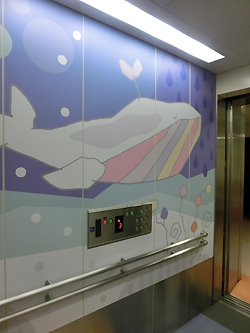 小さなエレベーターは正面のガラス周りを、大きなエレベーターはベッドで乗ることもあるそうなので、横になってもよく見える側面を装飾。